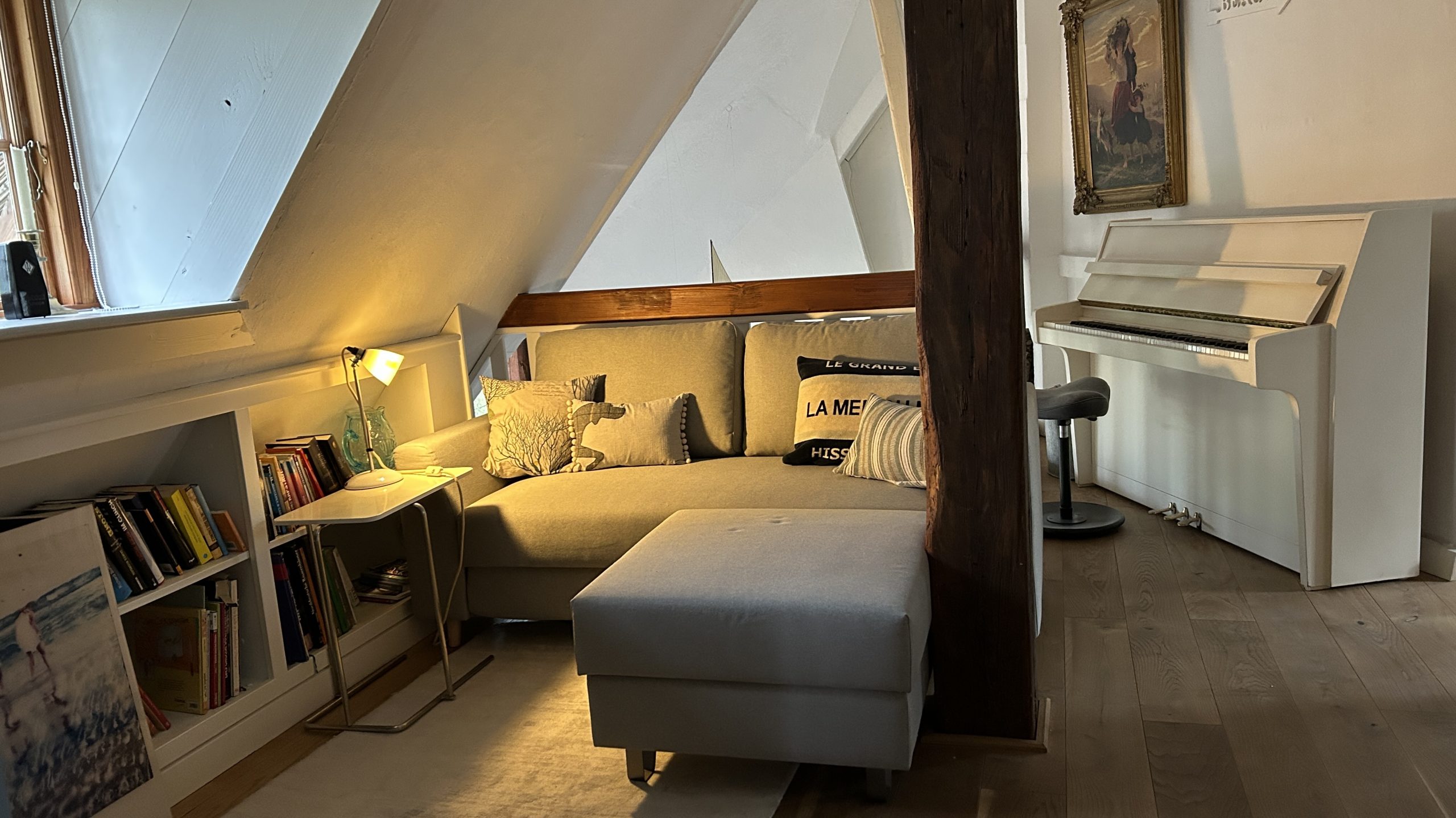 Das Duschbad ist mit Fußbodenheizung, Handtuchwärmer, viktorianischen Bodenfliesen und englischen Armaturen und Keramik ausgestattet. Fön, Shampoo, Seife und Handtücher sind selbstverständlich vorhanden. Direkt vor ihrem Apartment befindet sich die Galerie, wo ein gemütliches Sofa mit Smart TV steht, als auch eine kleine Bibliothek und ein Klavier zu finden sind. Dieser Bereich steht in der Zeit wo Sie die Wohnung gemietet haben ausschließlich Ihnen zur Verfügung.