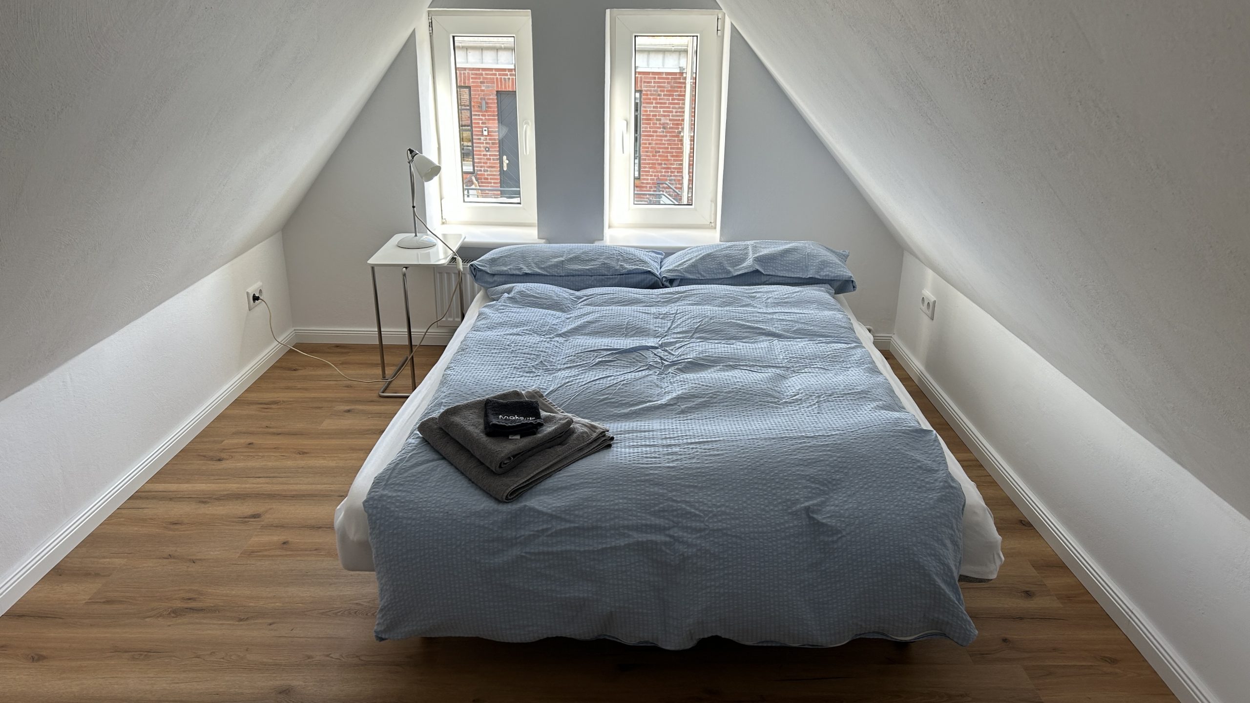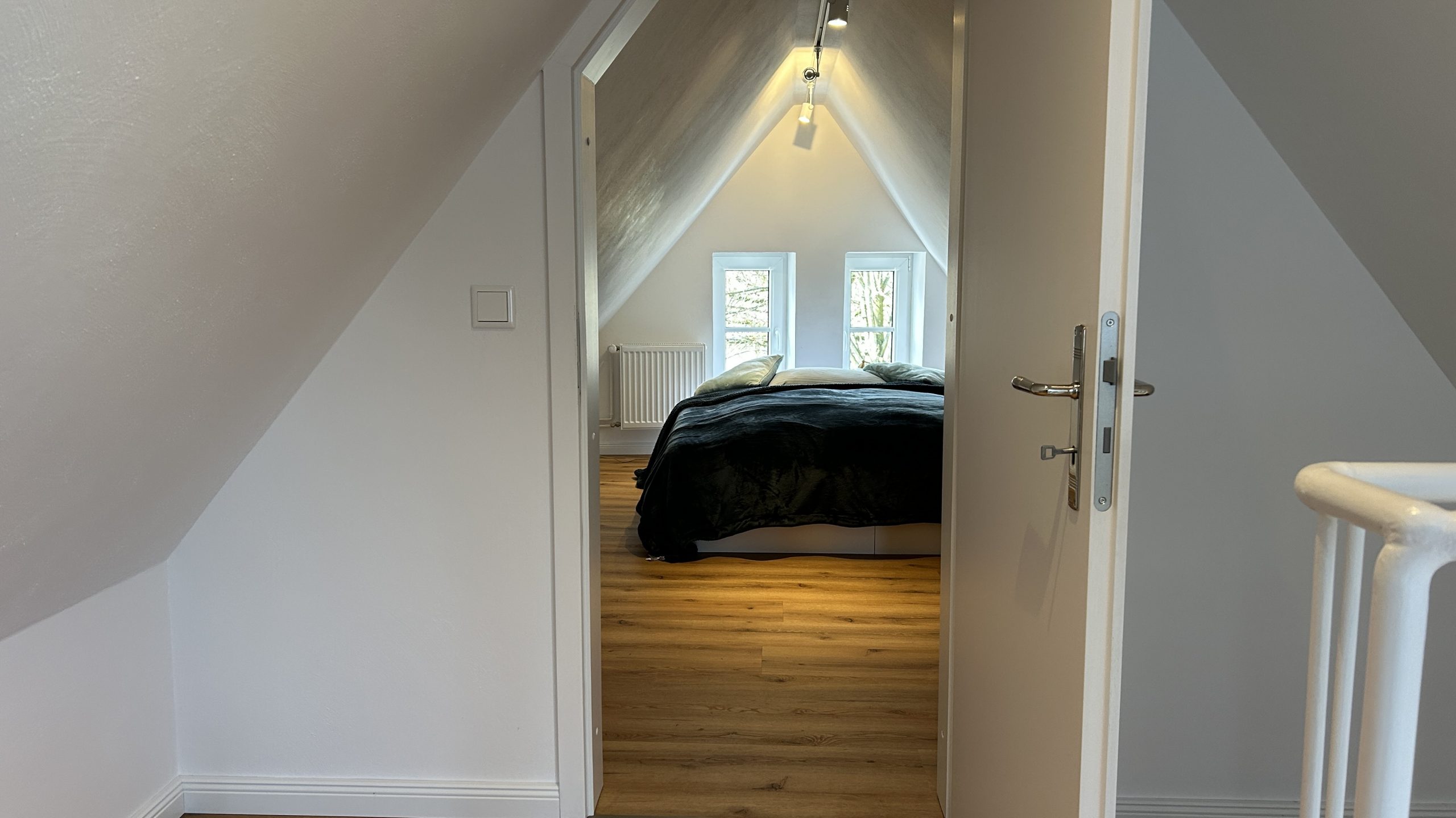 Im ersten Stock befinden sich die zwei Schlafzimmer, die jeweils mit Smart-TV ausgestattet sind. Das Masterbedroom für zwei Personen mit Boxspringbett (160 cm x 200 cm) hat einen wunderbaren Blick auf die Gracht und Treene. Das zweite Schlafzimmer mit Polsterbett (160 x 200 cm) hat den Blick auf die frisch angelegten Gründächer und den Innenhof mit Blick auf die alte Werkstatt mit den beiden Loftwohnungen,