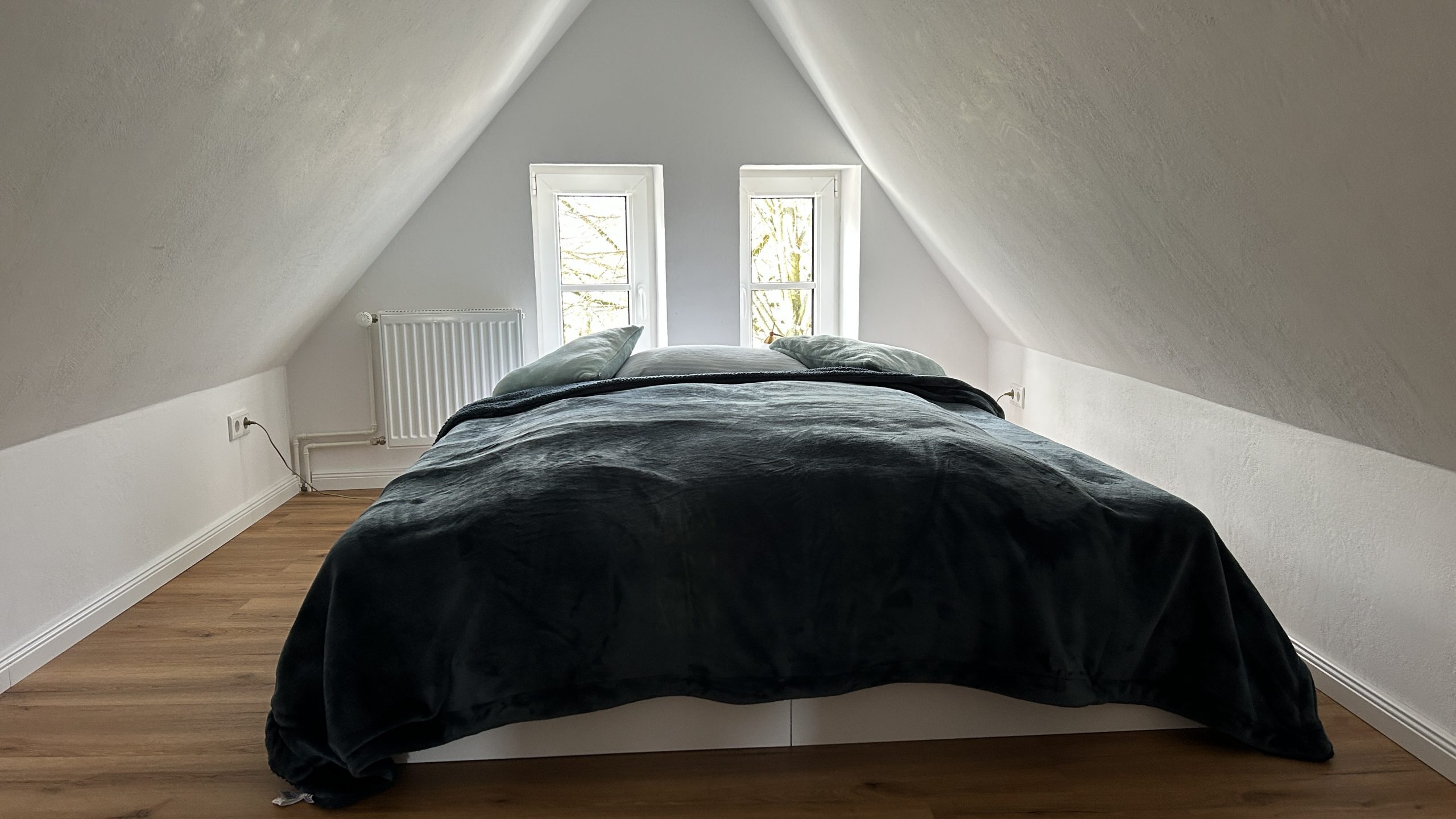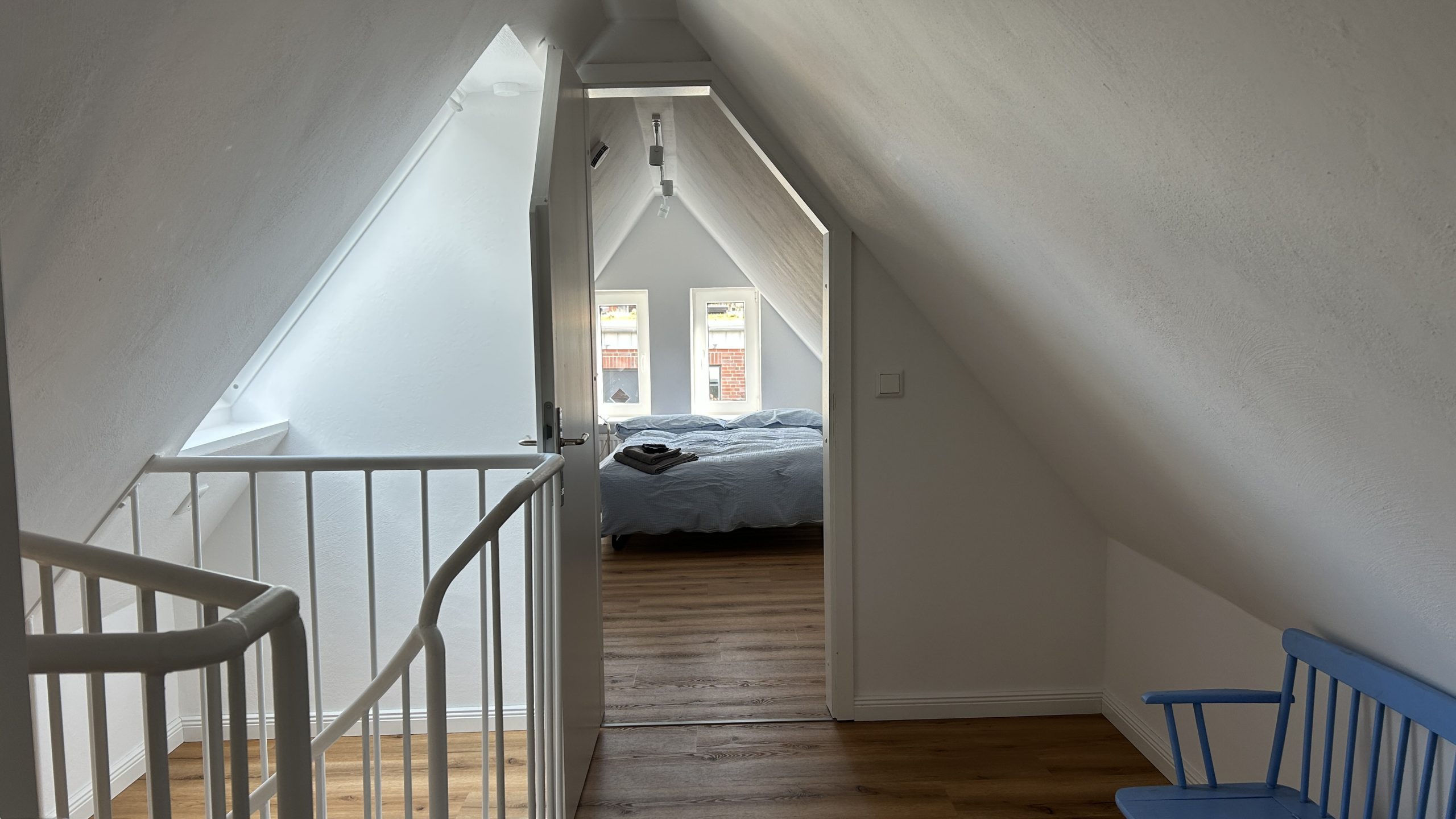 Im zweiten Stock, den man über eine Wendeltreppe erreichen kann befindet sich ein weiteres Schlafzimmer unter dem Dach mit einem 1,80 cm x 200 cm Bett. In diesem Schlafzimmer befindet sich ein weiterer Smart TV.