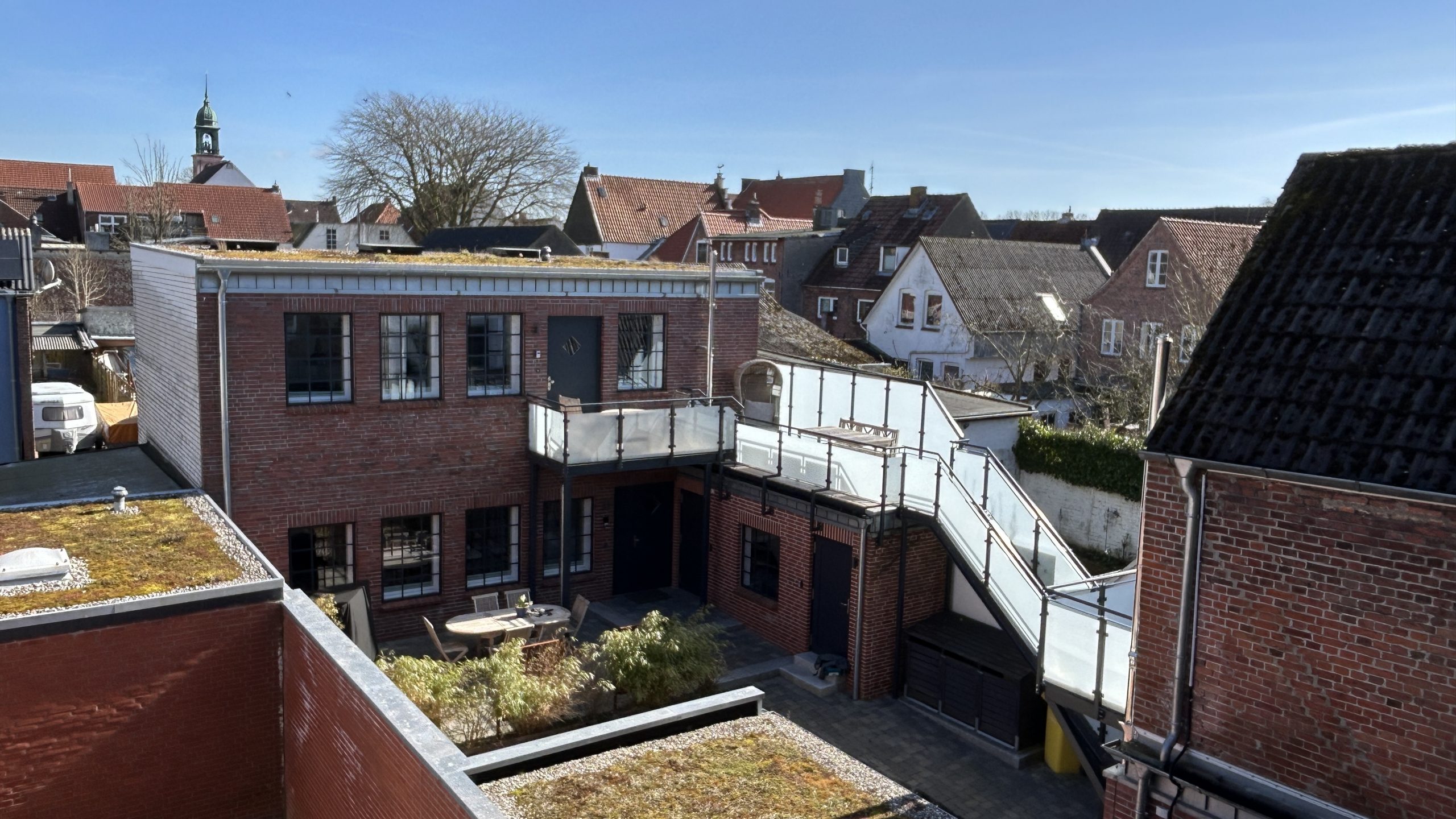 Der Balkon bietet den Blick auf die frisch angelegten Gründächer mit Blick auf die alte Werkstatt mit den beiden Loftwohnungen und schön gestalteten Innenhof.