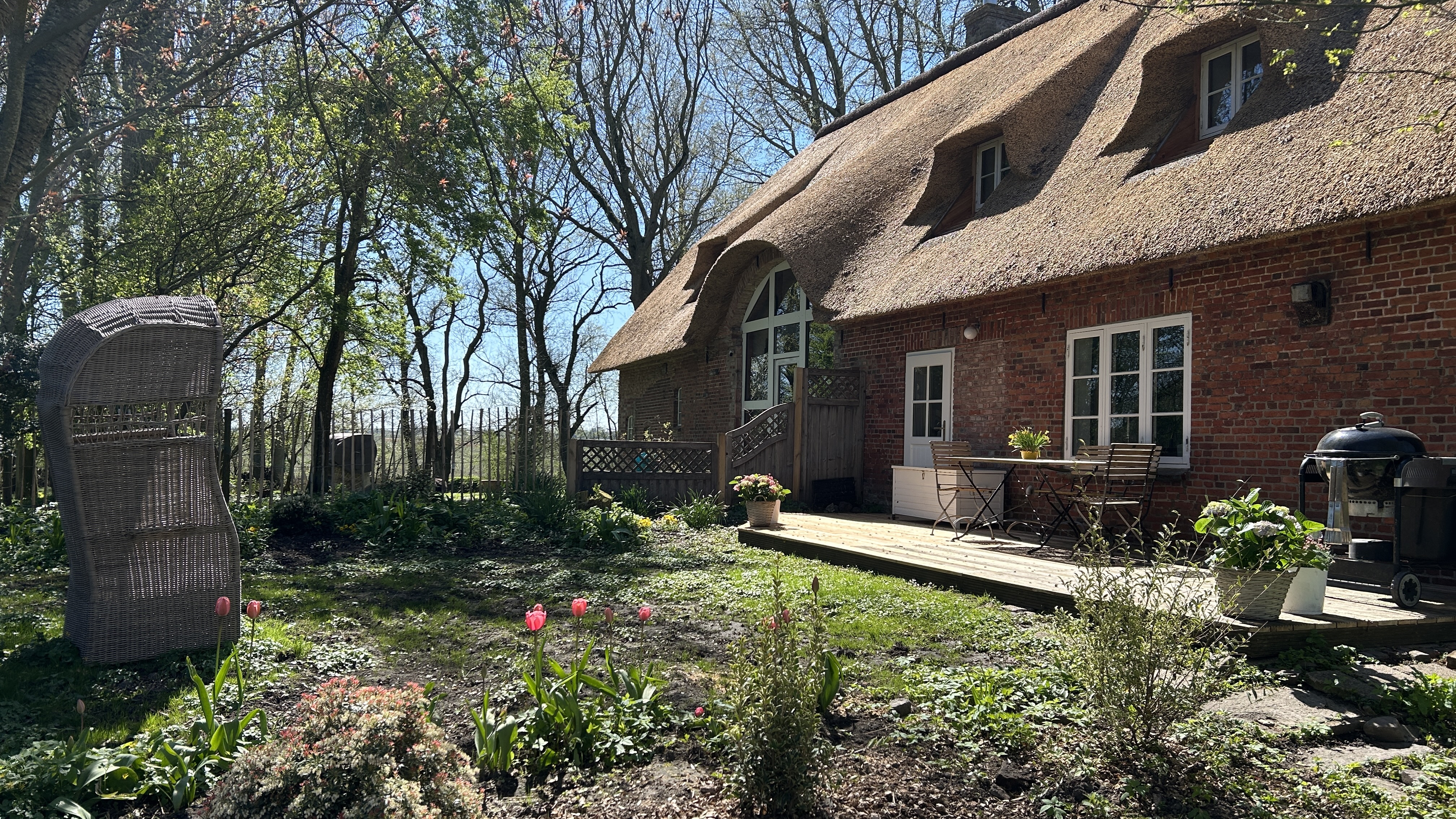 Das Apartment befindet sich im 1. Stock unterm Dach, direkt mit separatem Treppenaufgang vom Eingangsbereich aus. Durch das gute Raumklima des Reetdaches herrscht zu jeder Jahreszeit ein angenehmes Raumklima. Esszimmer und Küchenbereich sind mit einem Raumteiler in Stalloptik vom Schlafbereich getrennt. Das Polsterbett hat einen Topper für optimale Schlafqualität.