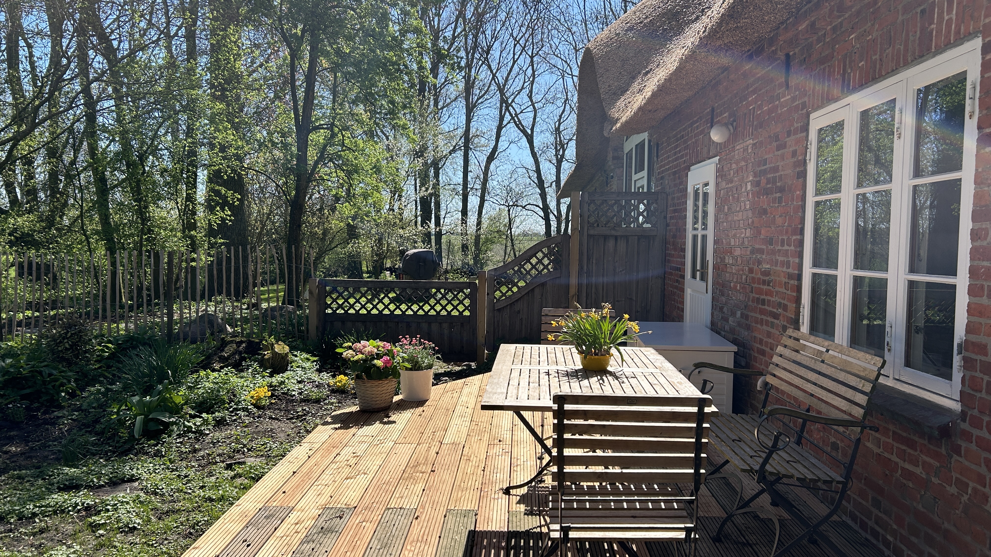 Von der Küche aus kommt man direkt über eine Terrassentür auf die Terrasse und den eingezäunten Gartenbereich, der nur Ihnen zur Verfügung steht – inkl. Weber-Grill.